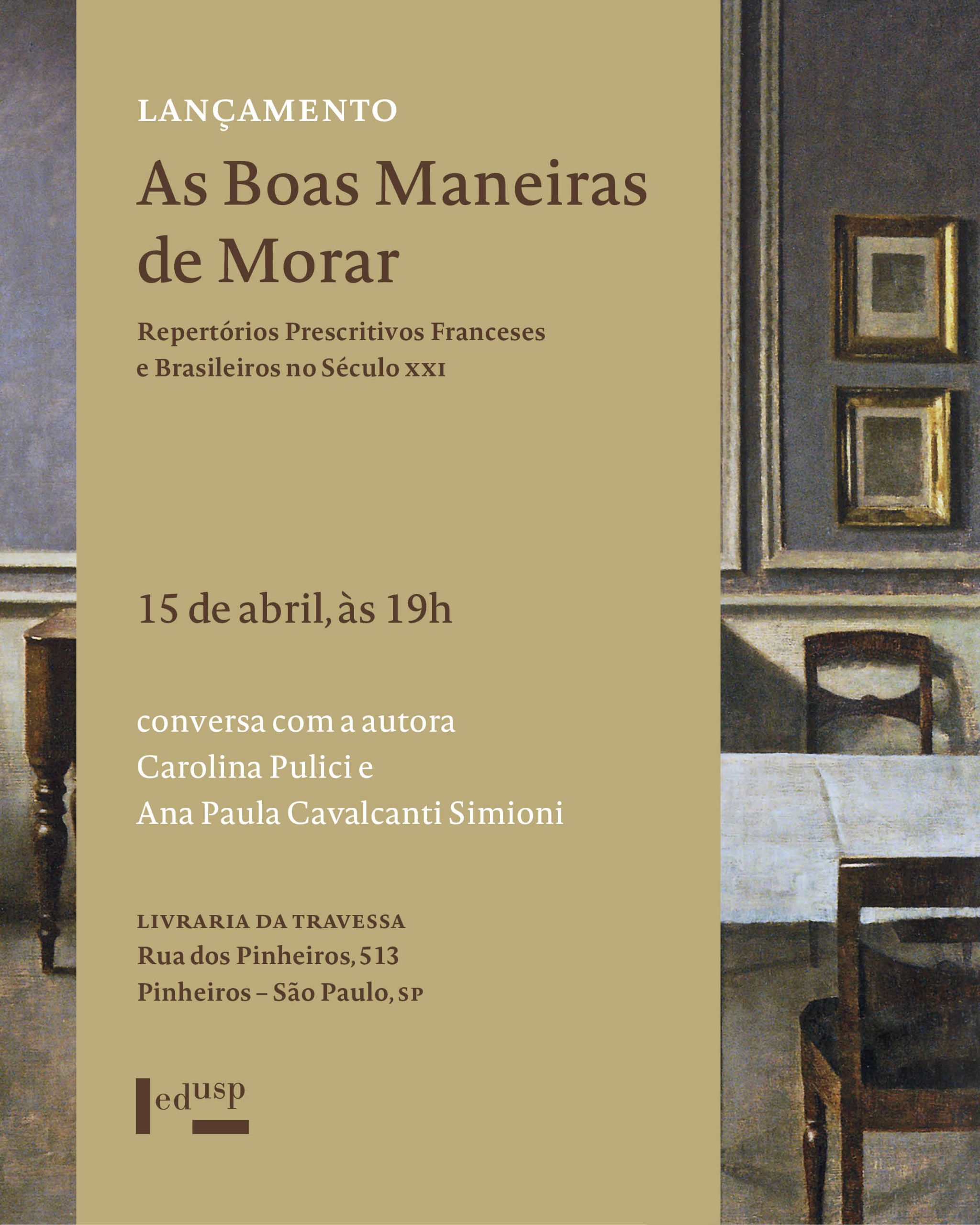 A Edusp convida a todos para o lançamento do livro As Boas Maneiras de Morar: Repertórios Prescritivos Franceses e Brasileiros no Século XXI que acontecerá no dia 15 de abril, a partir das 18h30, na Livraria da Travessa.