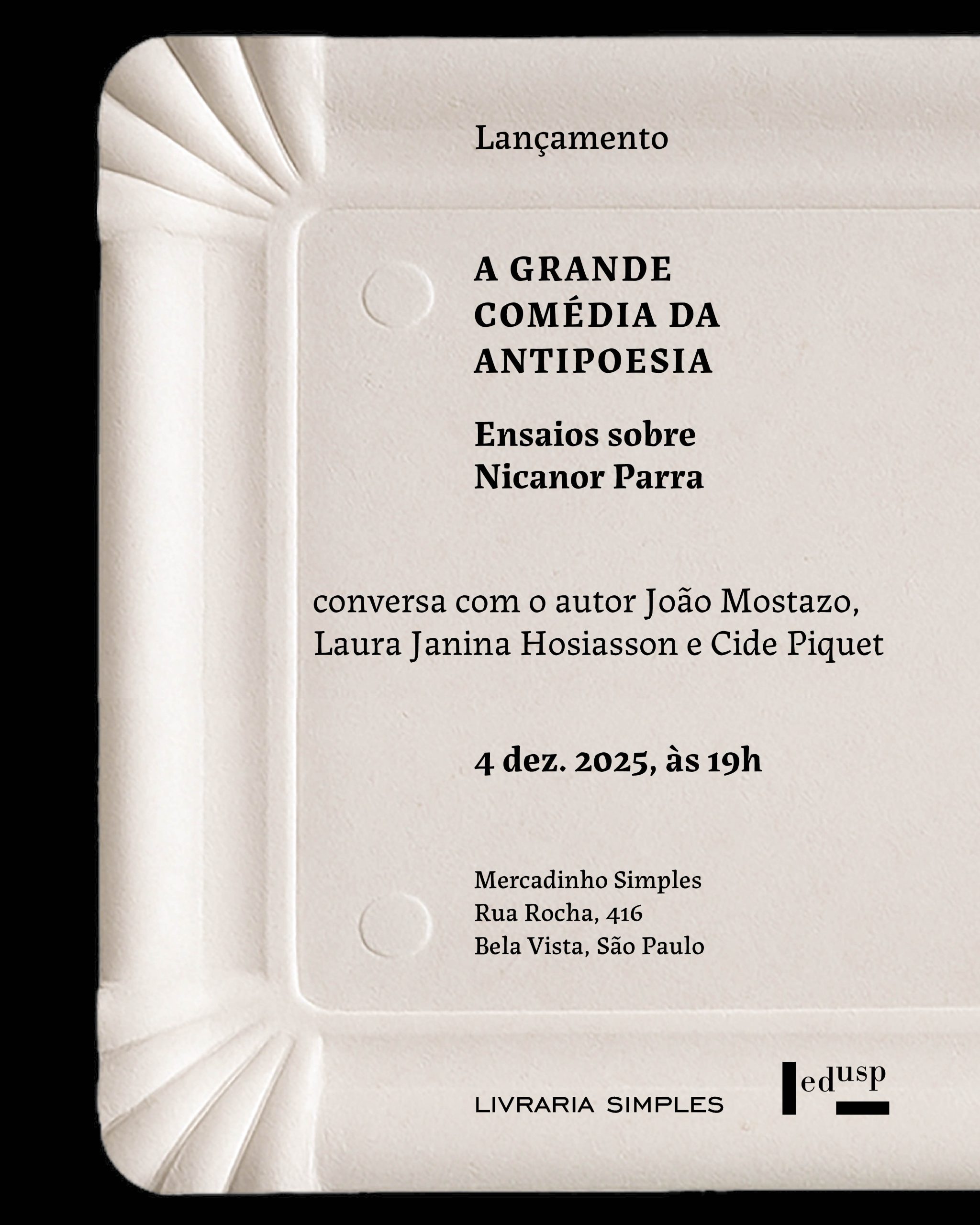 O lançamento de A Grande Comédia da Antipoesia já tem data marcada: 04 de dezembro, quinta-feira, a partir das 19h, no Mercadinho Simples.