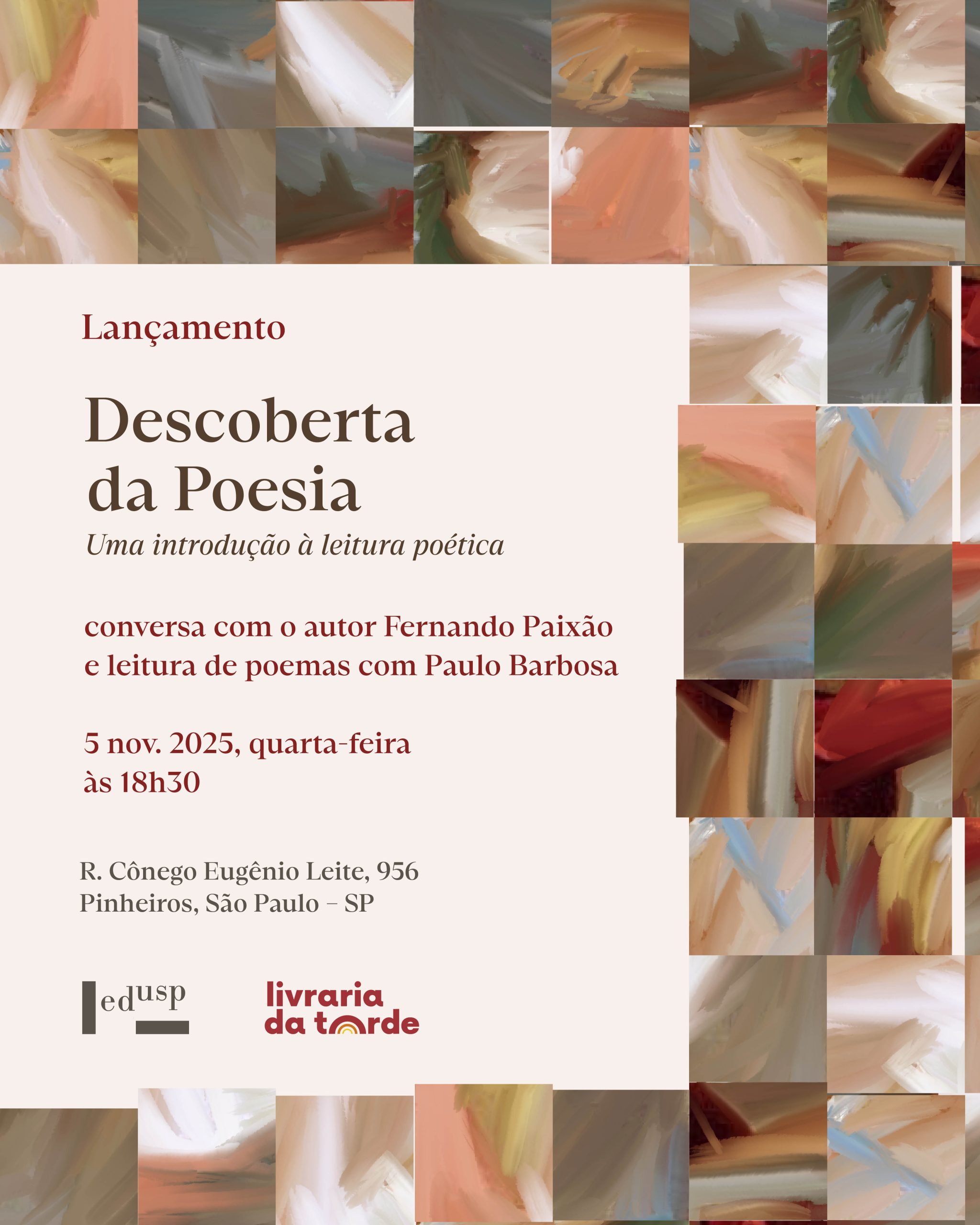 Vem aí o lançamento do livro Descoberta da Poesia, de Fernando Paixão. O evento está programado para dia 5 de novembro, quarta-feira, a partir das 18h30, na Livraria da Tarde.